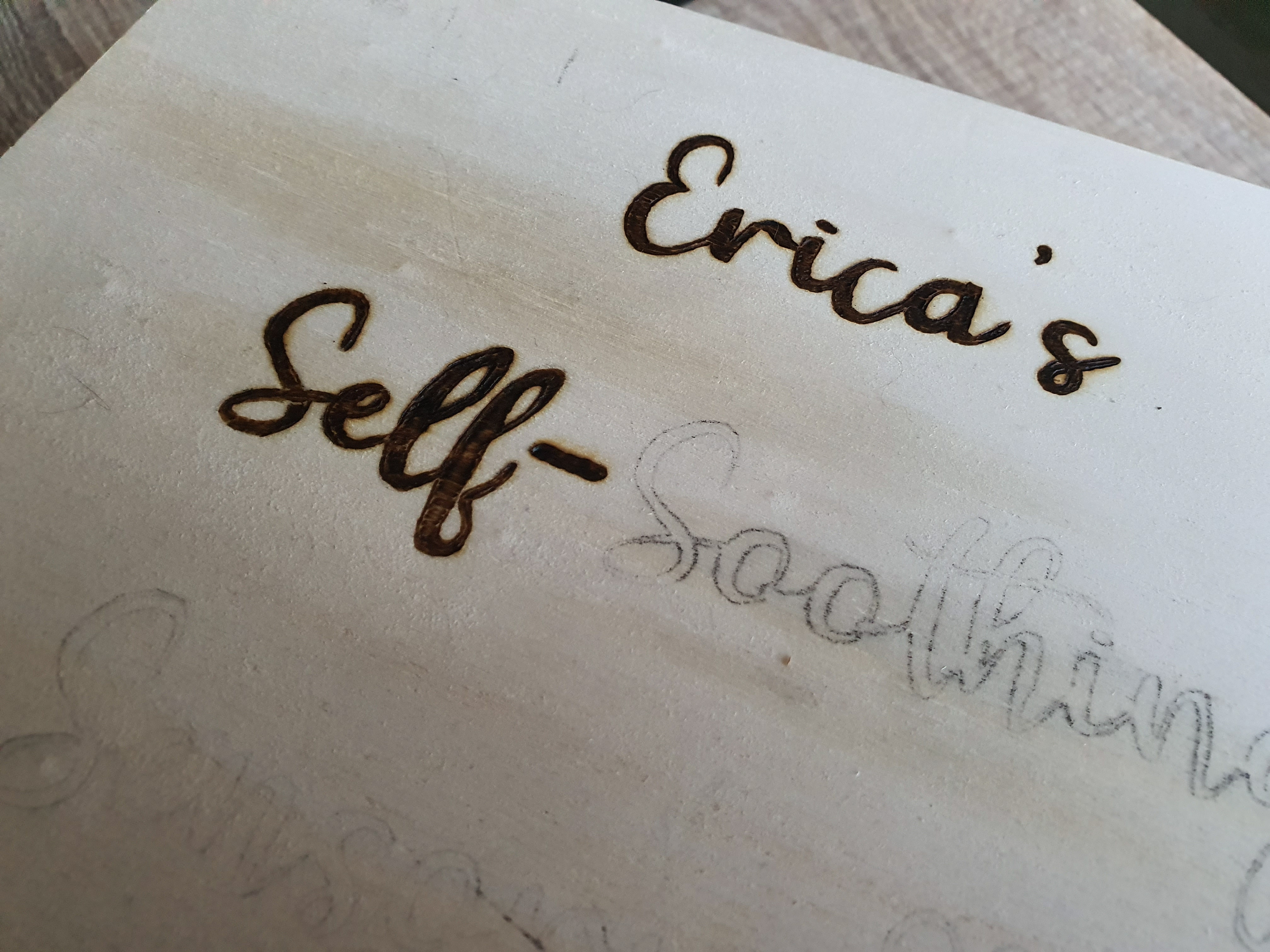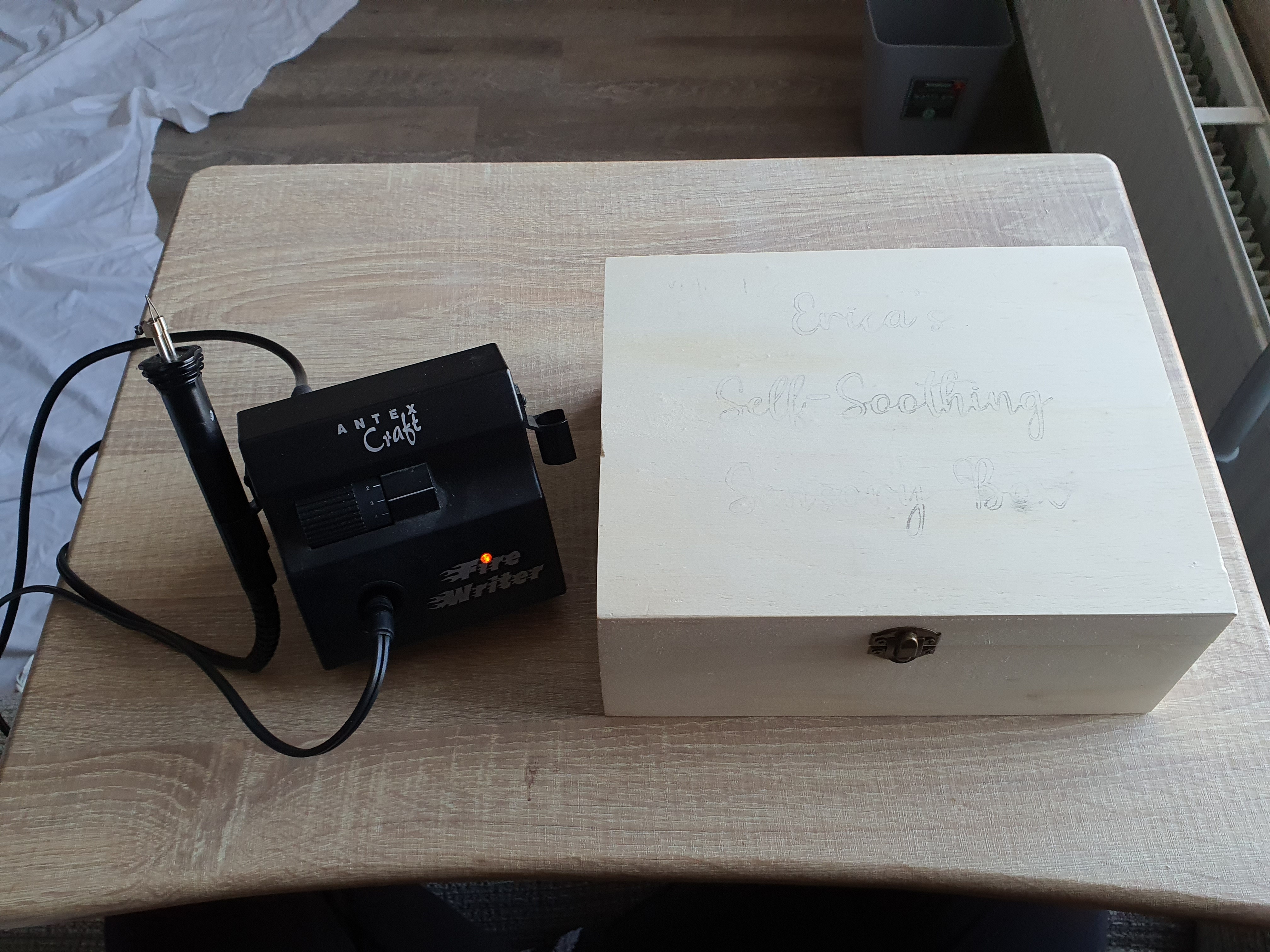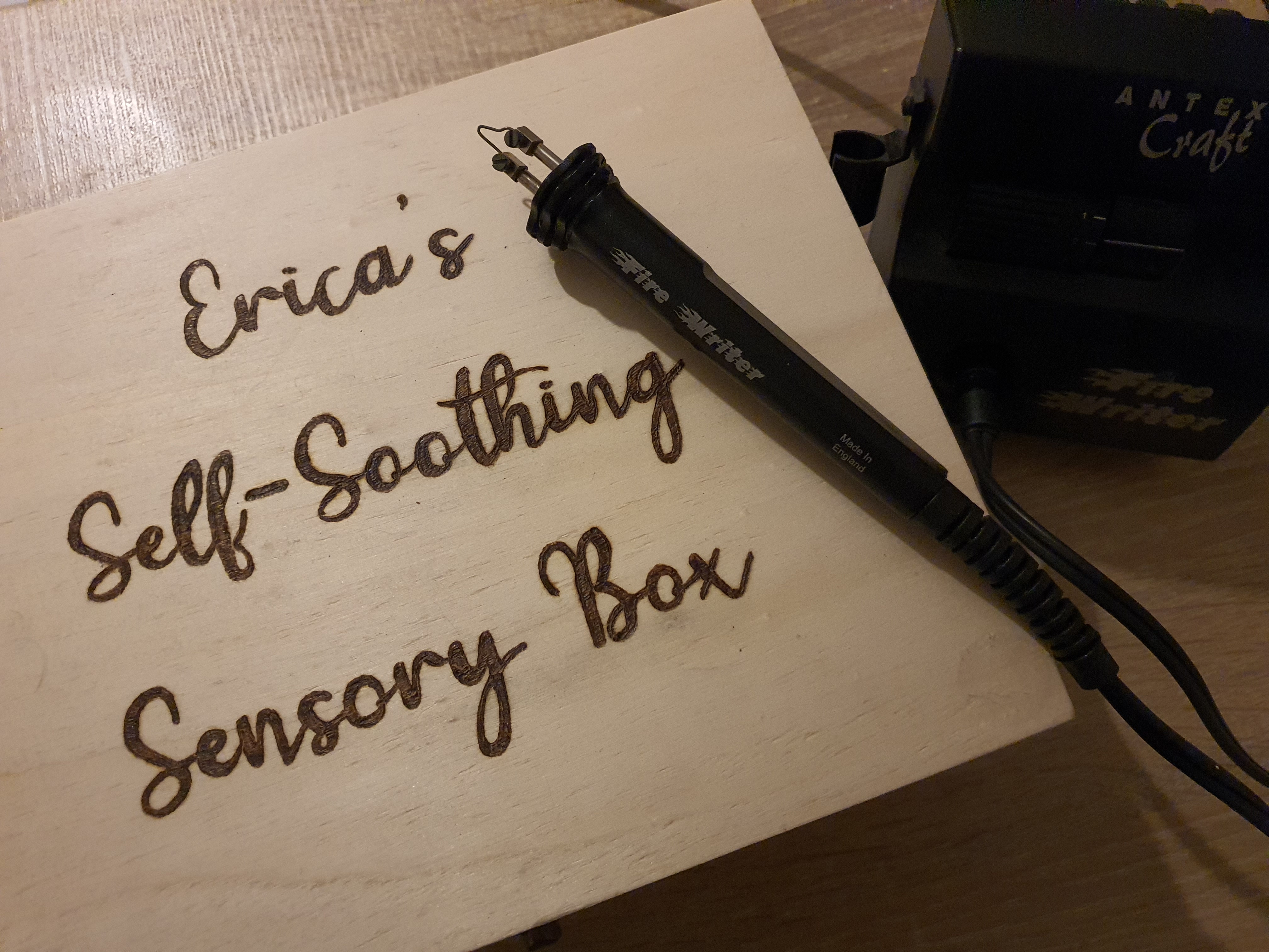 Just like sharing my hoard in my bag for self-care and comfort, I’ll share with your my self-care box, which I’ve chosen to call ‘Erica’s Self-Soothing Sensory Box’. I used a £4 wooden box available from The Works (Wooden boxes are available at other stores too…!) with the intention of doing some decoupage, but after months of it sitting there blank, I thought with lockdown being the time to crack on with all those “I’ll-get-round-to-it-later projects”, I might as well dig out my pyrography kit and burn it!