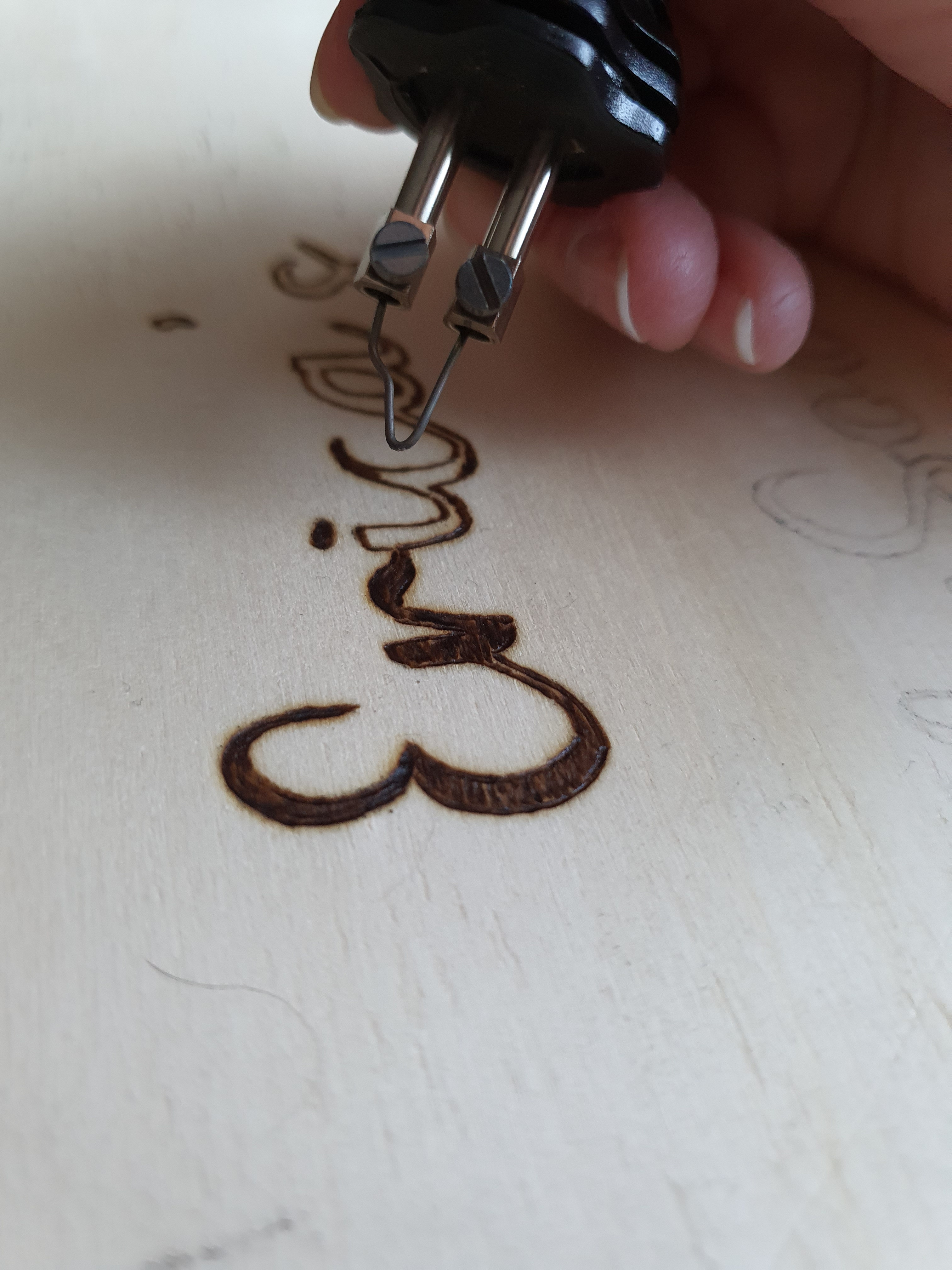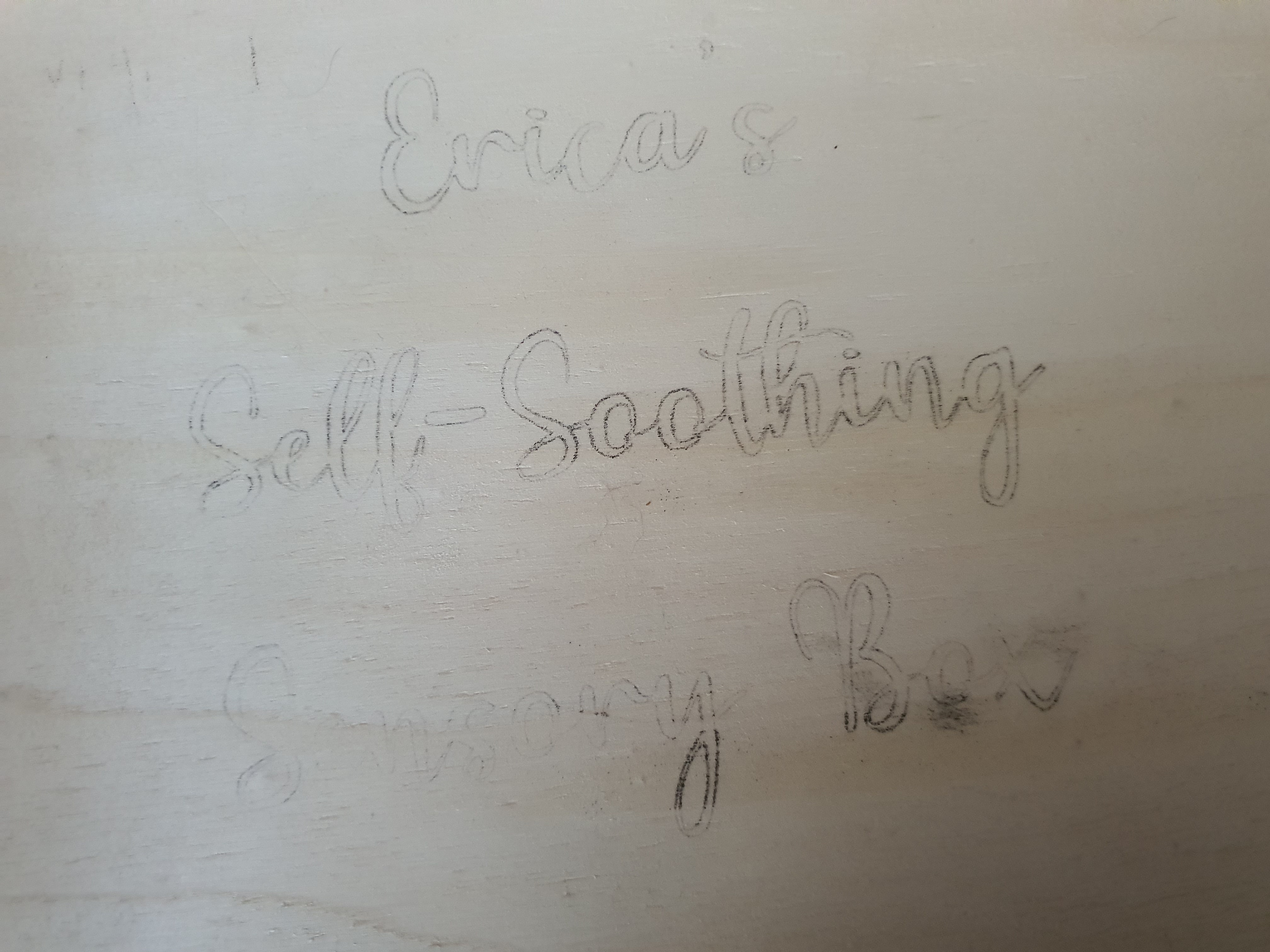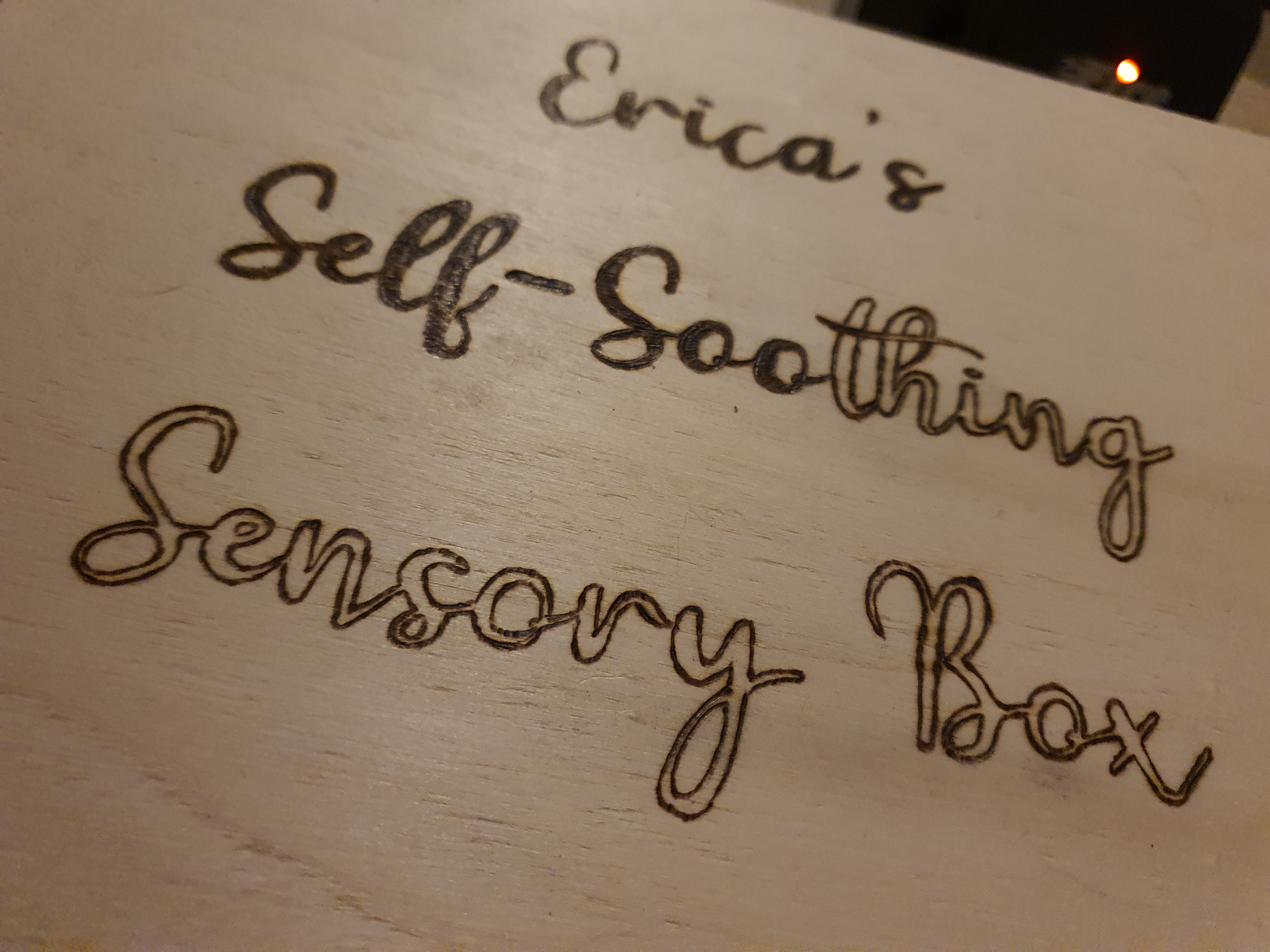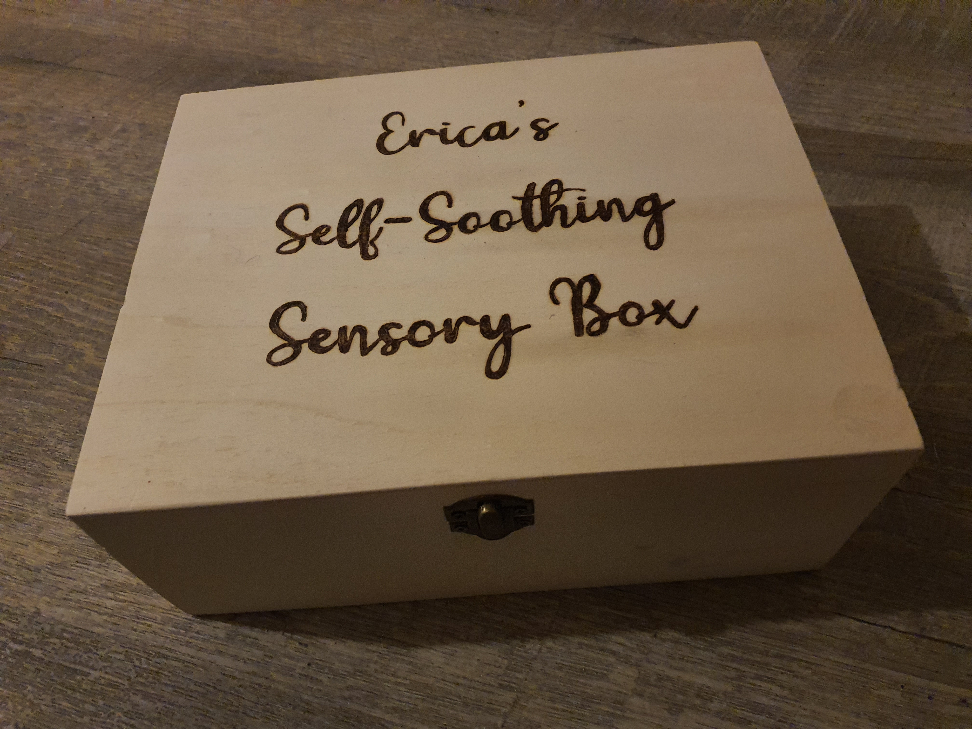 Just like sharing my hoard in my bag for self-care and comfort, I’ll share with your my self-care box, which I’ve chosen to call ‘Erica’s Self-Soothing Sensory Box’. I used a £4 wooden box available from The Works (Wooden boxes are available at other stores too…!) with the intention of doing some decoupage, but after months of it sitting there blank, I thought with lockdown being the time to crack on with all those “I’ll-get-round-to-it-later projects”, I might as well dig out my pyrography kit and burn it!