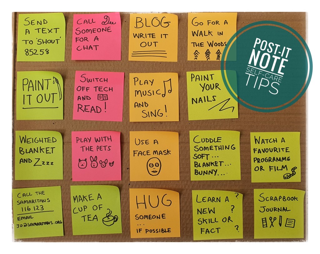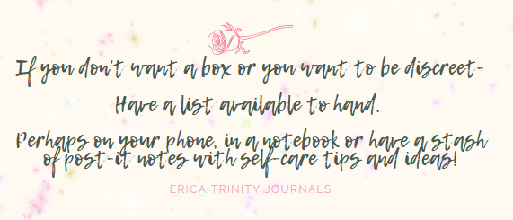 Before I finish, I just wanted to show you the post-it notes as well, because I think this is a great way for you to do if you haven’t got the space to store a box, or you want it to be discreet to members of your household. This type of option could also be done as a note on your phone – Write a list of activities you enjoy, so you can scroll through and pick one you’d like to do (Perhaps you could number each one, and then use a random number generator so it’s completely random!)